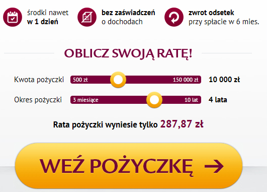 Platforma kredytowa oferuje: tani kredyt gotówkowy w tym konsolidacyjny i dla firm oraz pożyczki bez bik. Chwilówki Warszawa do ręki.Kredyt dla firmy – jeśli Twoja firma potrzebuje szybkiej gotówki sprawdź oferty kredytów dla przedsiębiorców w Banku BPH‚ Citi Handlowym‚ Eratii‚ GETIN Banku i